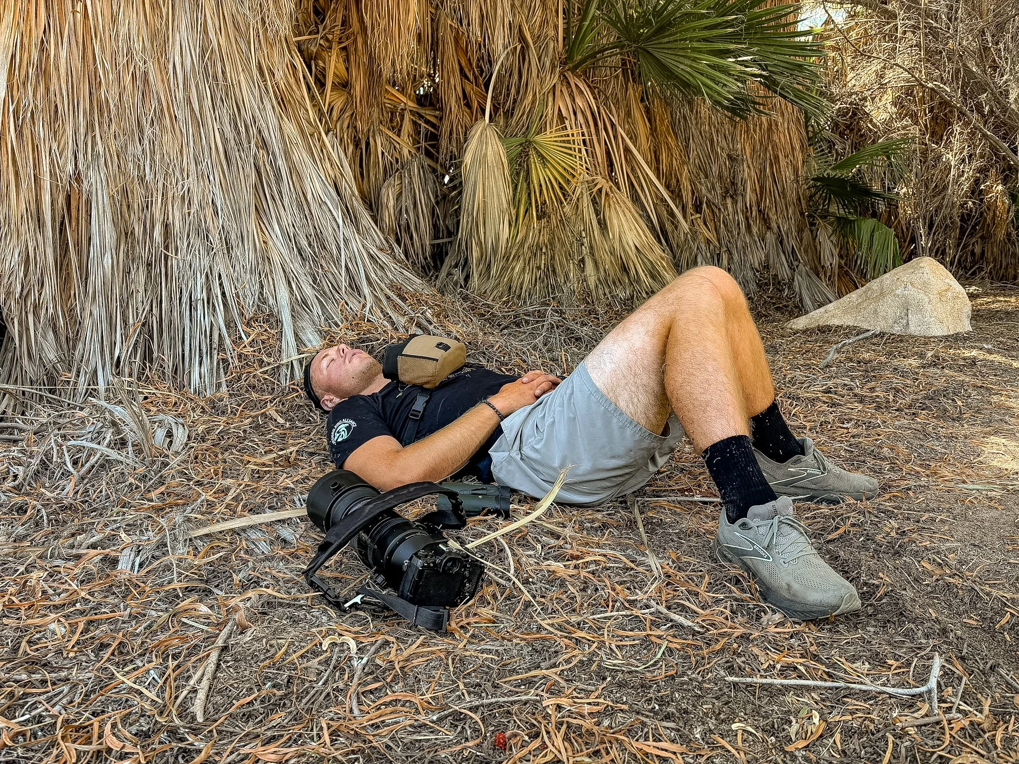 “Yep,” I say, slowly taking off my camera, bending over through the aching soreness that encompasses my entire lower body, and setting my gear on the ground. I plop down on my butt and gradually rest my back on a pile of fronds. My legs kick out, and relief washes over me. I put my hands behind my head and stare up at the branches above me.