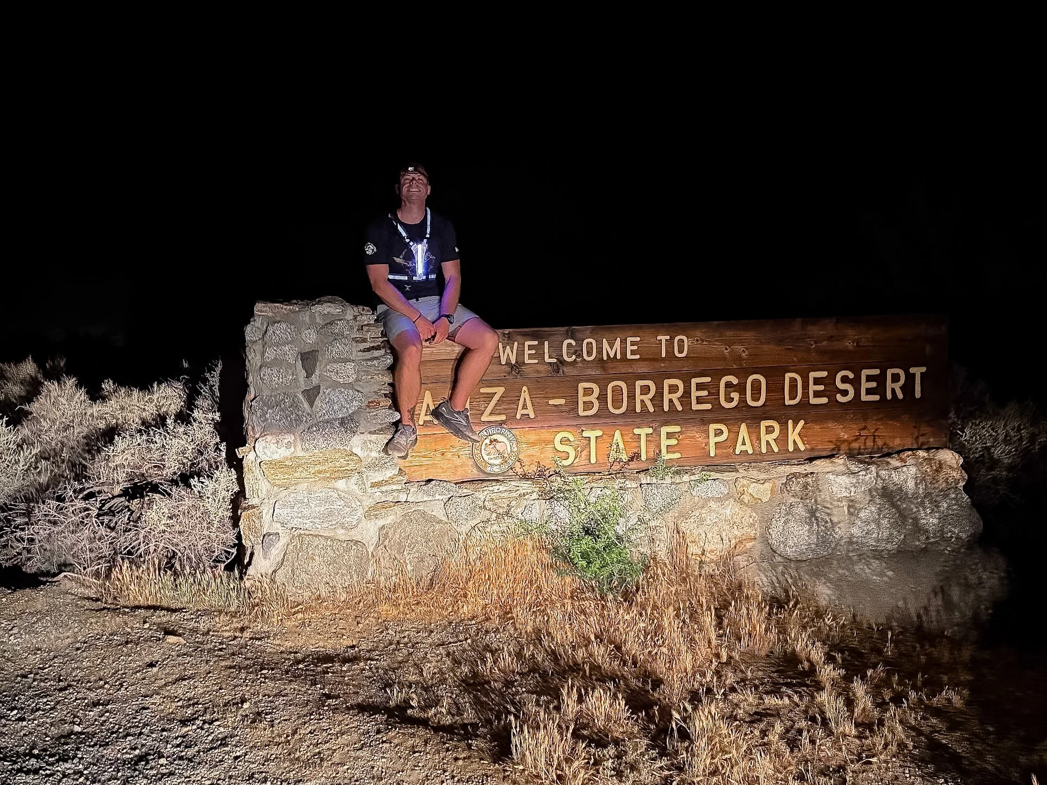 The fourth checkpoint is at roughly the halfway mark, about 13 miles in. It’s also the start of the Anza-Borrego Desert State Park, right where the sign is, and at a low point full of vegetation that was supposed to provide us with one of the nocturnal species… Supposed to, but upon my arrival, it yields the same conversation as every other checkpoint. I take a longer break here, four minutes, and listen. Again, nothing but the wind. I was hoping it would die down once we were off the mountain, but it’s only picked up, enough so that I can feel it pushing me down the road.