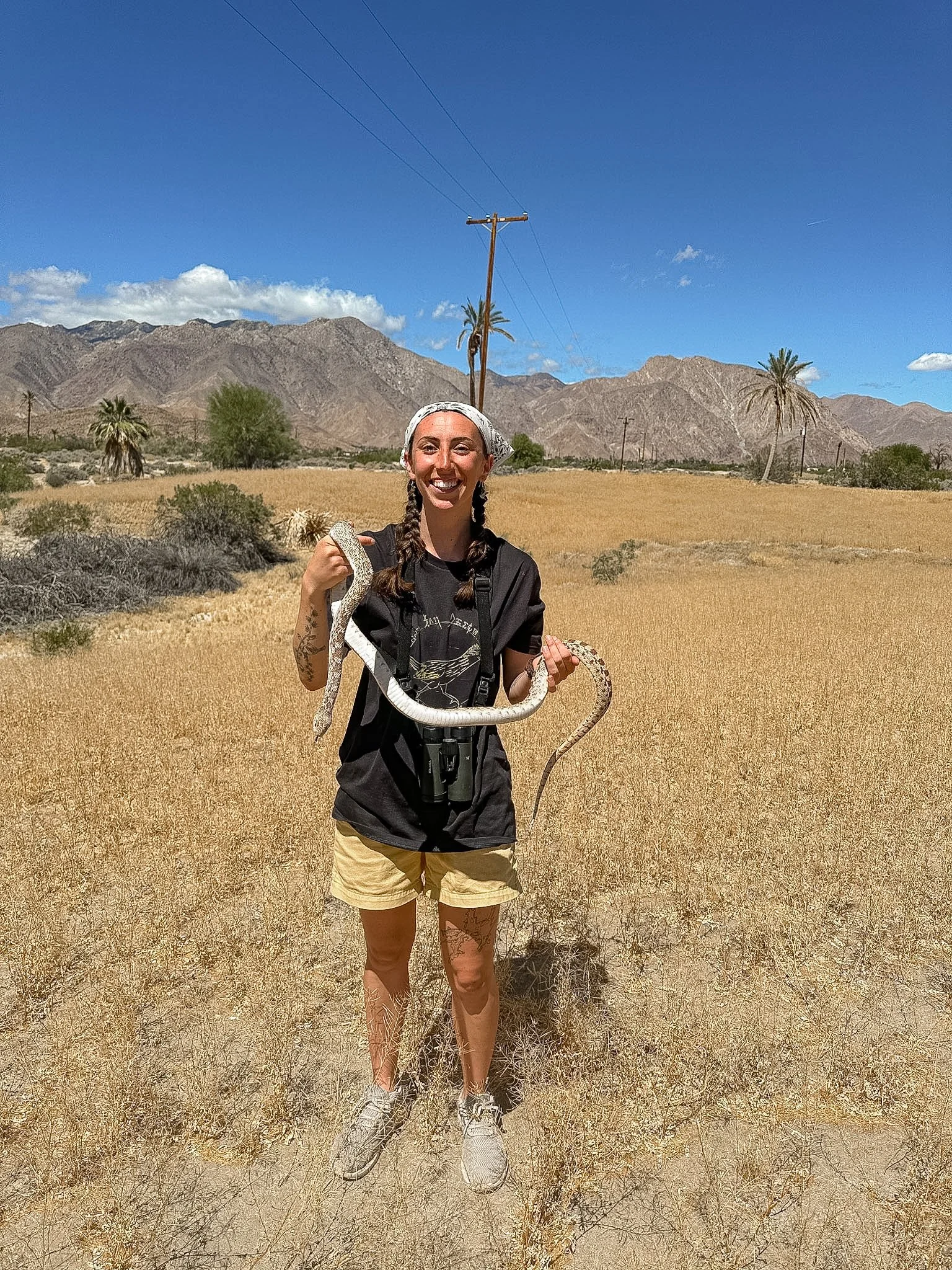 “Right there,” I say, and before my next thought, she takes three steps and scoops it up without an ounce of hesitation. The five-foot gopher snake attempts to slither away for a moment before it relaxes in her graceful hands.