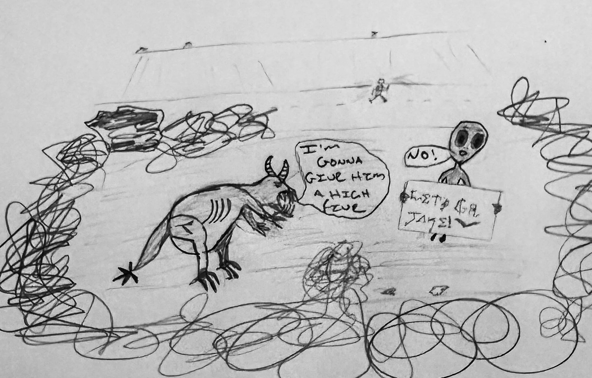 I start to run a little faster… but maybe they wouldn’t want to eat or abduct me. Maybe they’d think I’m cool. The road cuts through a hill, a mini 30-foot cliff on both sides. I imagine a little gray alien and a slightly larger gray skinwalker standing just out of sight, silently cheering me on. The alien is holding a homemade poster that says “Go Jake!” with a bird drawn next to it. The skinwalker turns to him and nervously says in an anxious whisper, “Ohhhh man, I want to go give him a high five!”