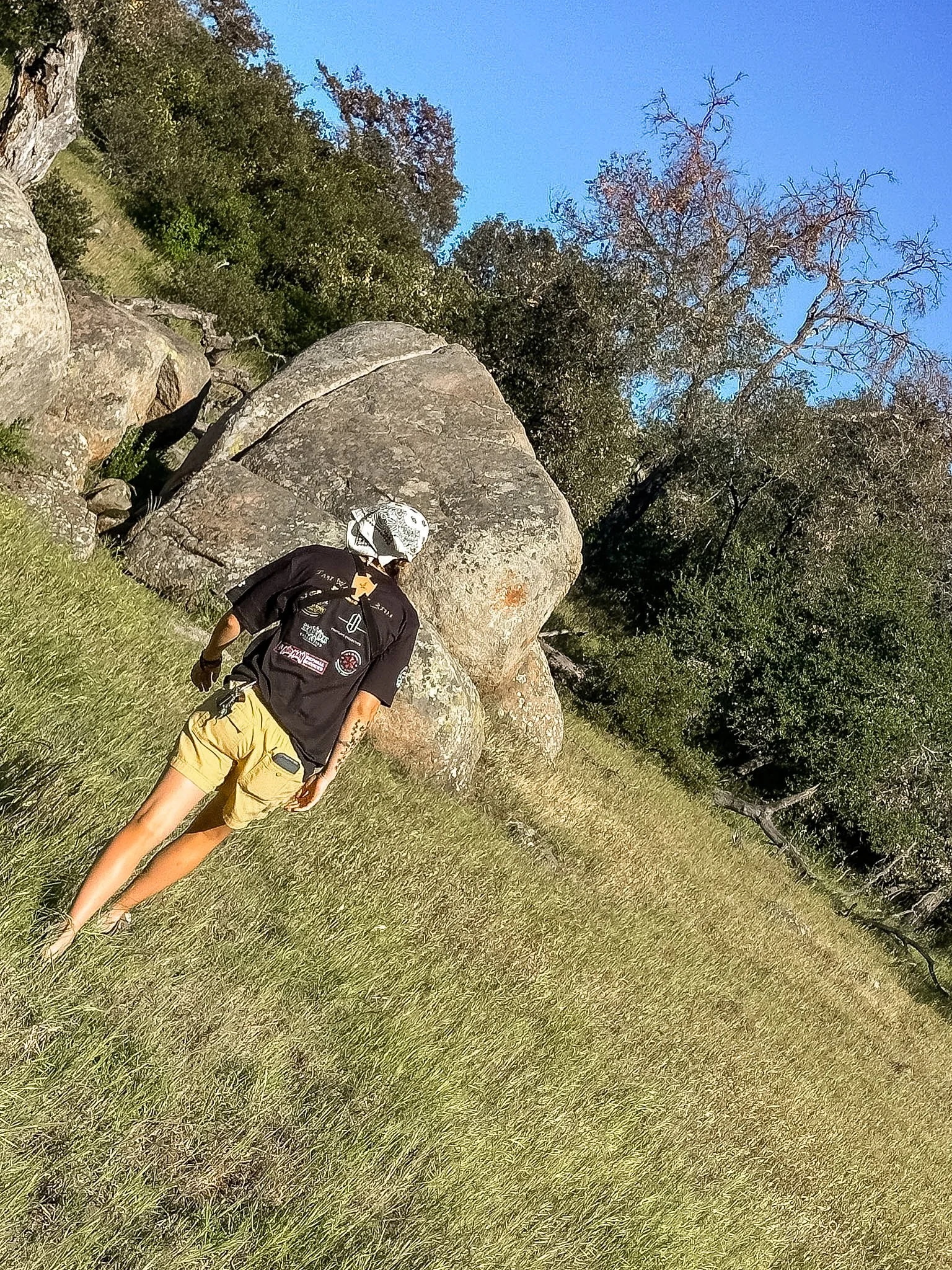 Unfortunately, it’s gated, motor vehicles aren’t allowed, so we walk the mile down the road, through the remnants of a forest fire, and are halted by dense brush. My knees feel weak. The sharp pain hasn’t returned since I stopped running, but navigating even the most basic uneven terrain is sketchy and makes me feel weak and wobbly.